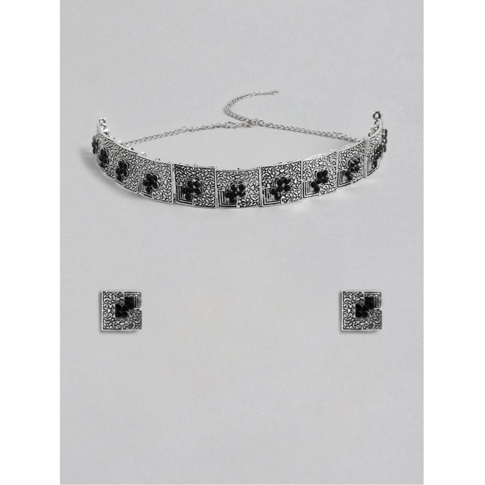 Women's Rose Gold Plated Alloy Necklace & Earings Set (Silver & Black)
