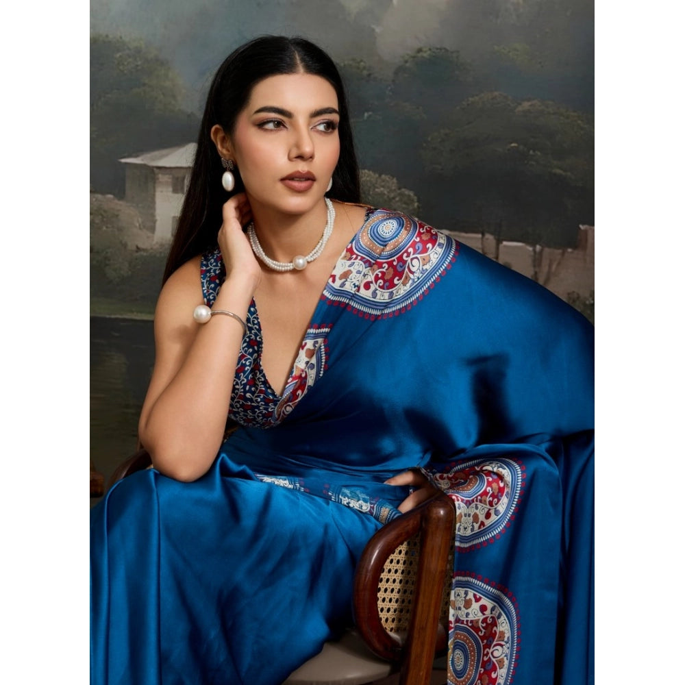 Women's Satin Crepe Printed Saree With Unstitched Blouse 5.5Mtr (Blue)