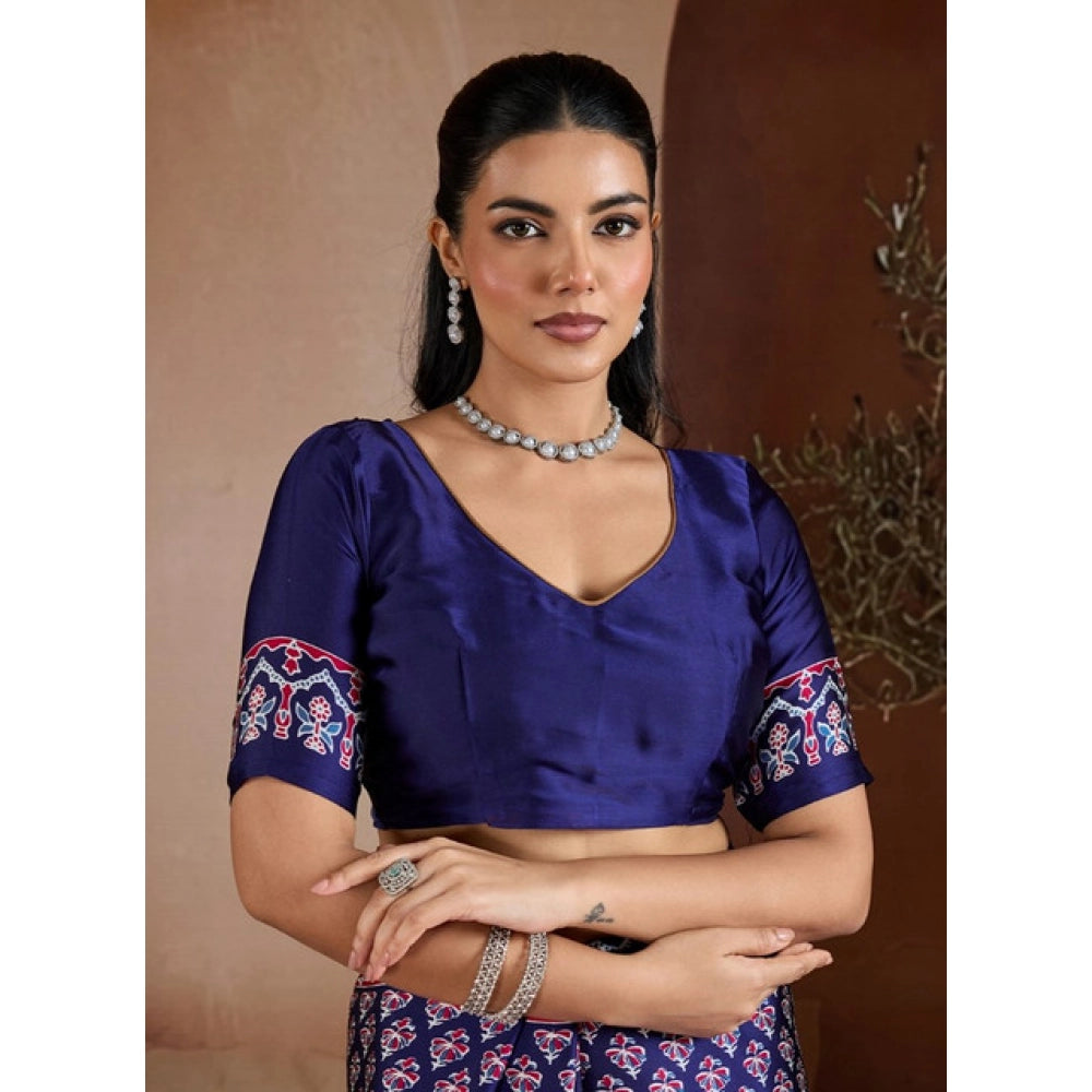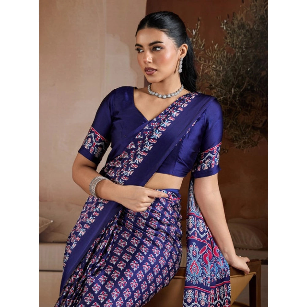 Women's Satin Crepe Printed Saree With Unstitched Blouse 5.5Mtr (Navy Blue)