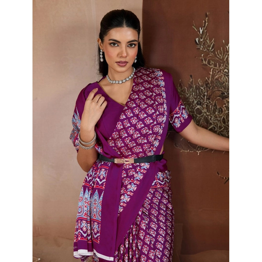 Women's Satin Crepe Printed Saree With Unstitched Blouse 5.5Mtr (Purple)